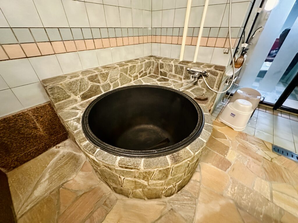 こちらは石造りの丸い浴槽。重厚感があり、ゆったりと浸かることができます。