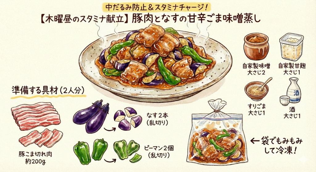 週の後半、木曜日あたりにおすすめ。ご飯がすすむ甘辛い味噌味が、疲れた体に染み渡ります。ナスはアク抜き不要でそのまま使えます。