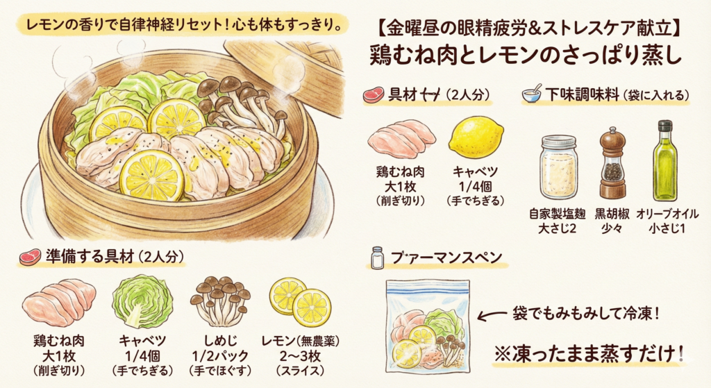 どれも「袋に入れて揉み込むだけ」、食べる時は「凍ったまま蒸すだけ」の簡単レシピです。