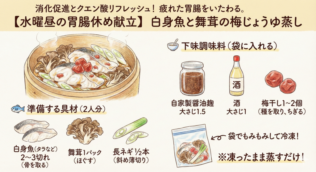 胃腸を休めたい水曜日のお昼などに最適。梅干しの酸味と醤油麹のコクが、淡白な白身魚を極上の蒸し料理に変えてくれます。