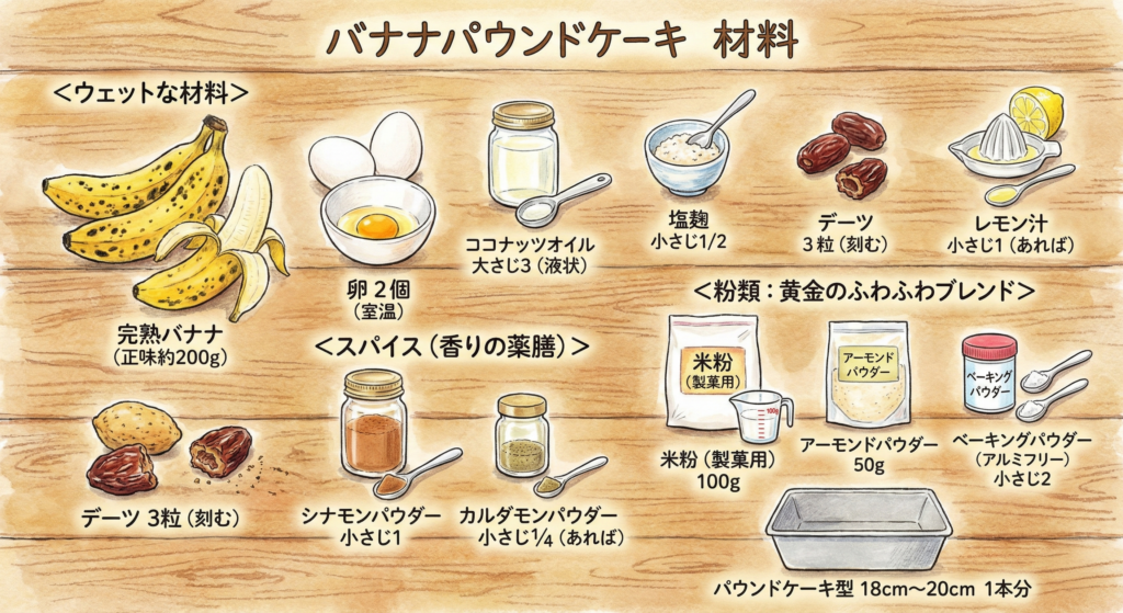- 完熟バナナ:2〜3本(正味約200g)※黒い斑点(シュガースポット)があるもの!