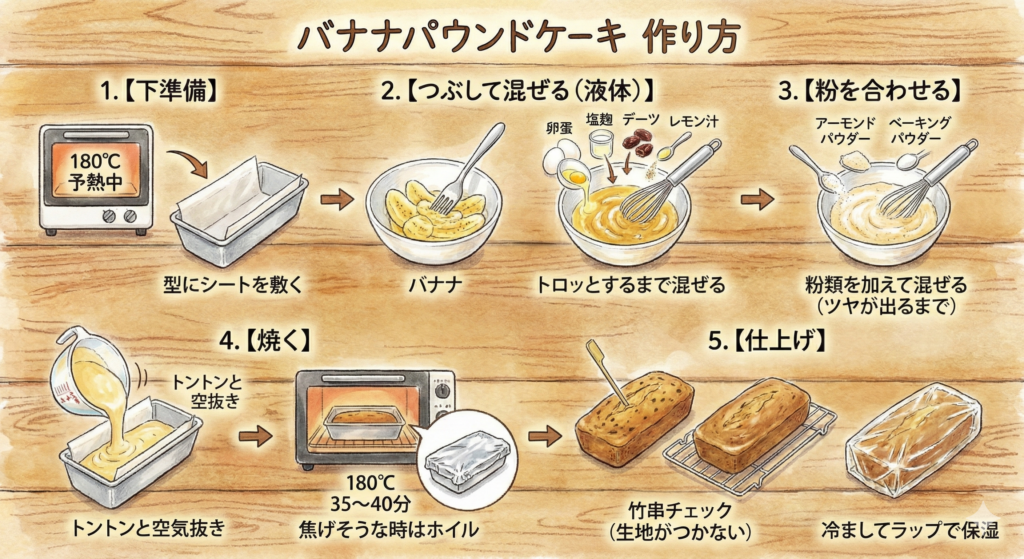 - 粉を合わせる:粉類を加え、ダマが消えてツヤが出るまでぐるぐると混ぜ合わせる。